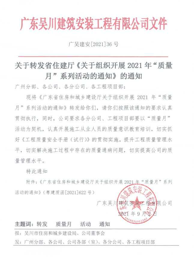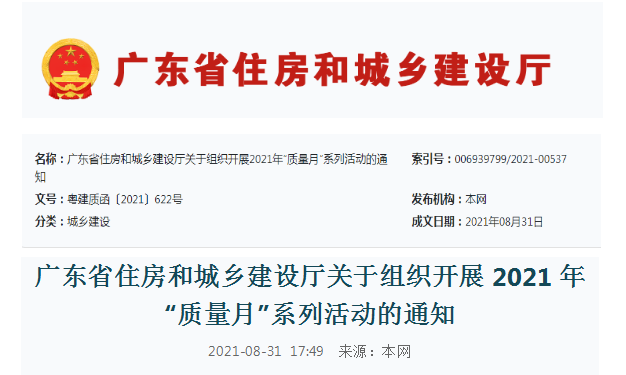 為深入貫徹習近平新時代中國特色社會主義思想,全面落實黨的十九大和十九屆二中、三中、四中、五中全會精神,牢固樹立“質量第一”的意識,不斷提升建筑工程品質,根據(jù)《市場監(jiān)管總局等20個部門關于開展2021年全國“質量月”活動的通知》(國市監(jiān)質〔2021〕51號),我廳決定于9月組織開展2021年全省住房城鄉(xiāng)建設系統(tǒng)“質量月”活動。現(xiàn)將有關事項通知如下: